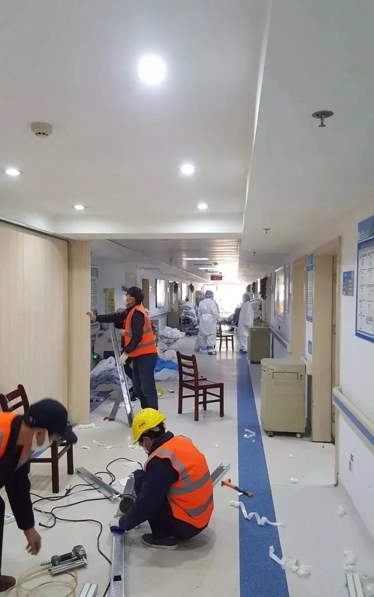 ? ? ? 2月17日下午,在舊樓住院部其余樓層完成消毒之后,項目人員再次緊急前往醫(yī)院,進行第二階段的施工,項目人員連軸轉(zhuǎn)直至第二天清晨。2月18日上午,為了嚴格貫徹上級“寧可讓床等人,也不要讓人等床”的指示,院方?jīng)Q定再新增一棟樓作為備用,在方案確定之后,公司積極響應,同步啟動第三階段施工,由于時間緊、任務重,公司從其他收尾項目抽調(diào)了10余名管理人員,60多名工人進行人員補充,確保了新樓舊樓同步施工。