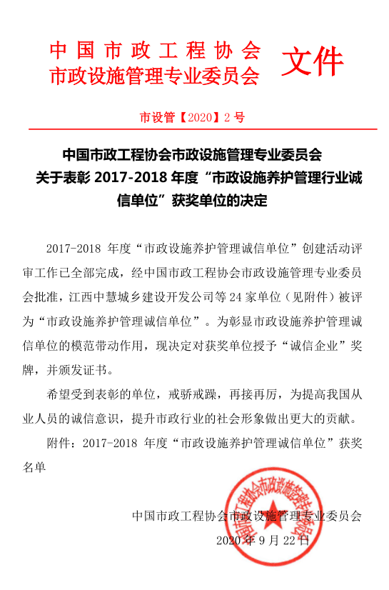 近日,經(jīng)過中國市政工程協(xié)會市政設(shè)施管理專業(yè)委員會評選,漢陽市政首次榮獲2017-2018年度“市政設(shè)施養(yǎng)護(hù)管理誠信單位”,彰顯了公司在市政管養(yǎng)領(lǐng)域的模范帶頭作用。