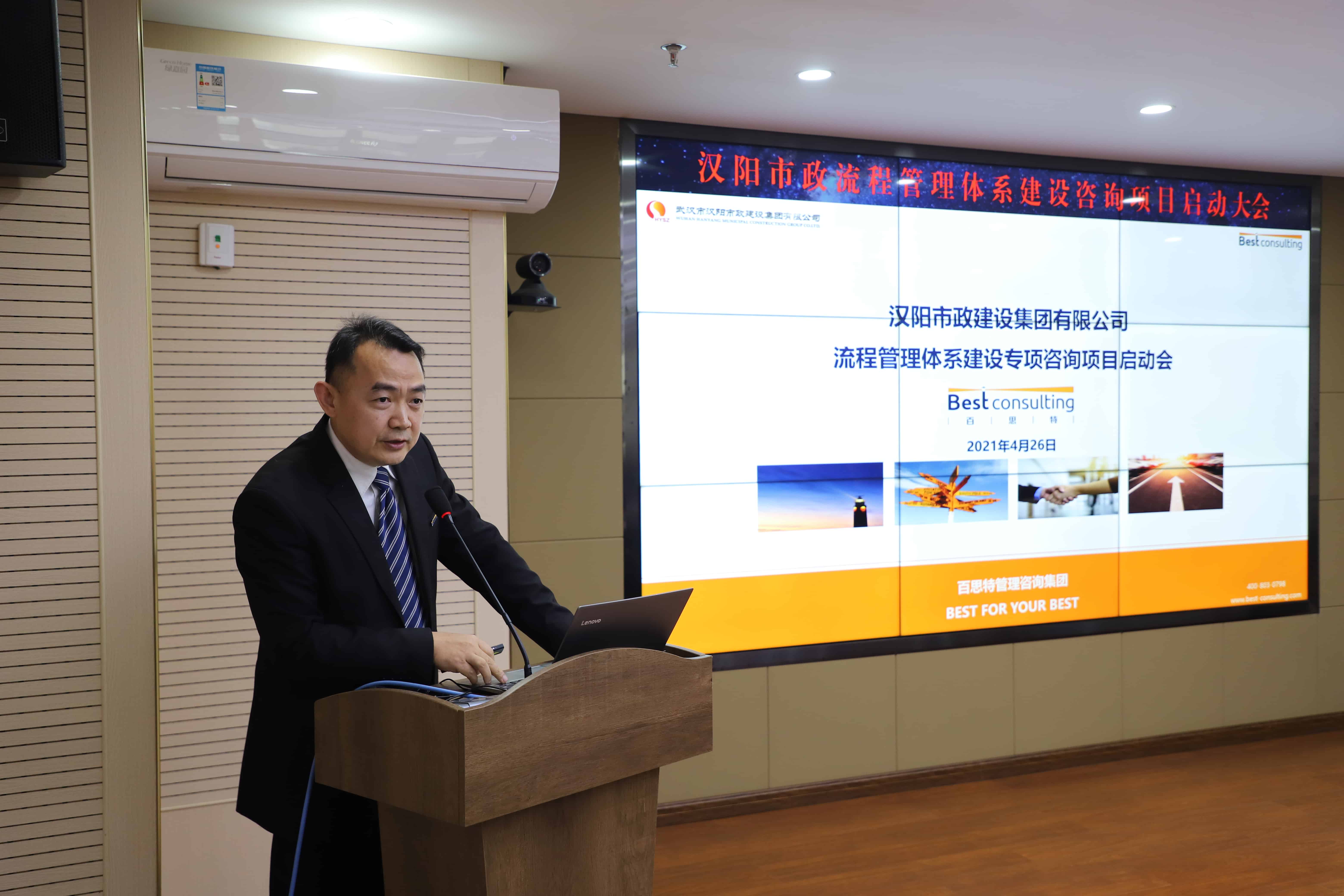 4月26日下午,漢陽市政流程管理體系建設(shè)咨詢項目啟動大會順利召開。漢陽市政黨委書記、董事長嚴(yán)悌文等黨委班子成員,各分子公司、機關(guān)各部門負(fù)責(zé)人,以及百思特管理咨詢有限公司常務(wù)副總裁、變革研究院執(zhí)行院長孟德強等項目顧問團(tuán)隊參加了會議。會議由集團(tuán)公司總經(jīng)理助理冷雪主持。