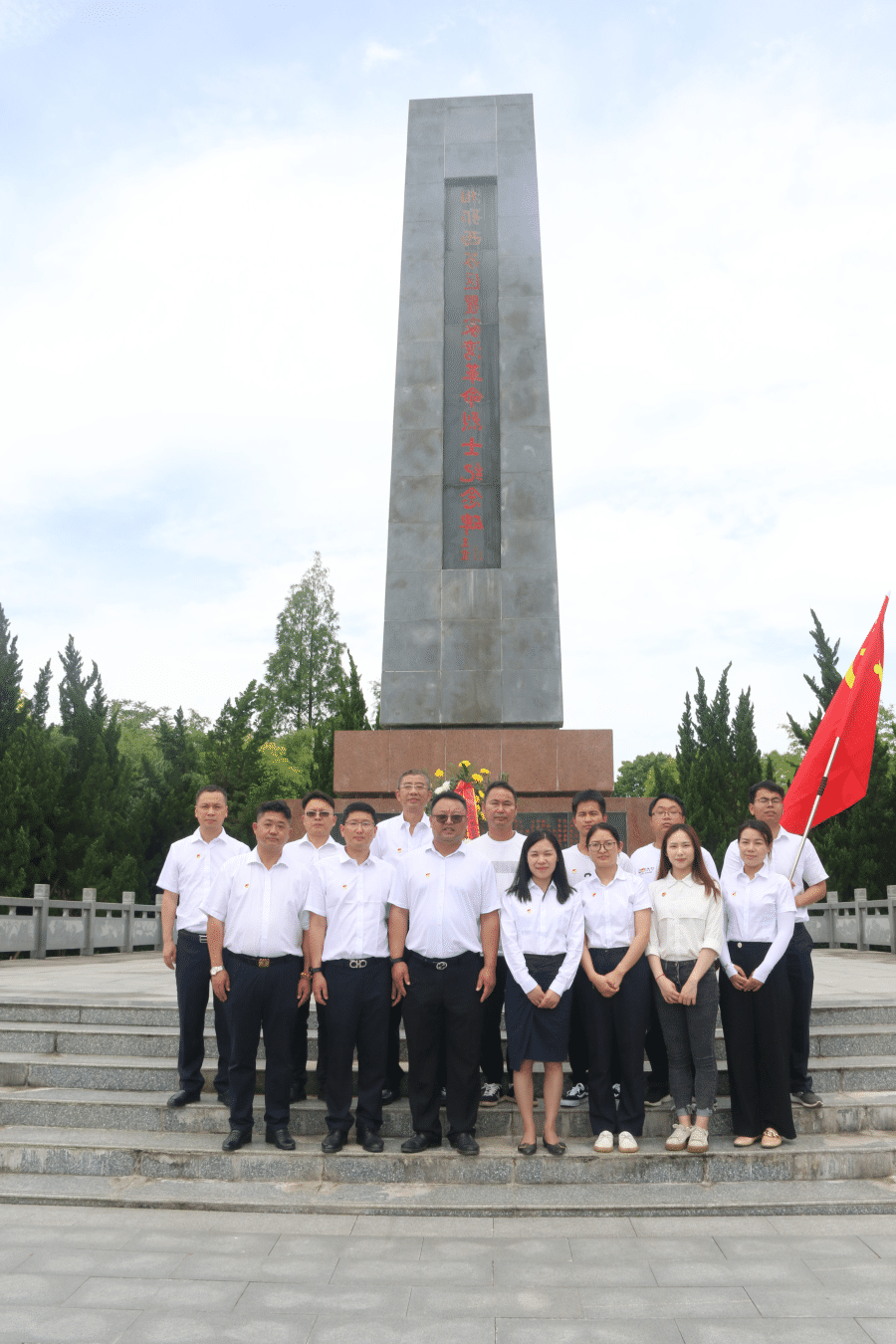 ? ? ? 向人民英雄敬獻(xiàn)花籃儀式,在瞿家灣烈士陵園紀(jì)念碑前舉行。全體黨員深深鞠躬,懷著敬仰之情,向革命烈士默哀。