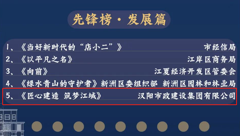 本次大賽共有565部作品參賽,經(jīng)專家評審會三次雙月賽和年度賽評選,將制作水平較高,生動反映武漢市黨建引領(lǐng)基層治理創(chuàng)新實踐成果的30部作品,評為年度先鋒作品。漢陽市政黨委選送的作品《匠心建造 筑夢江城》榮列其中,該作品由博宏公司具體負責策劃攝制。