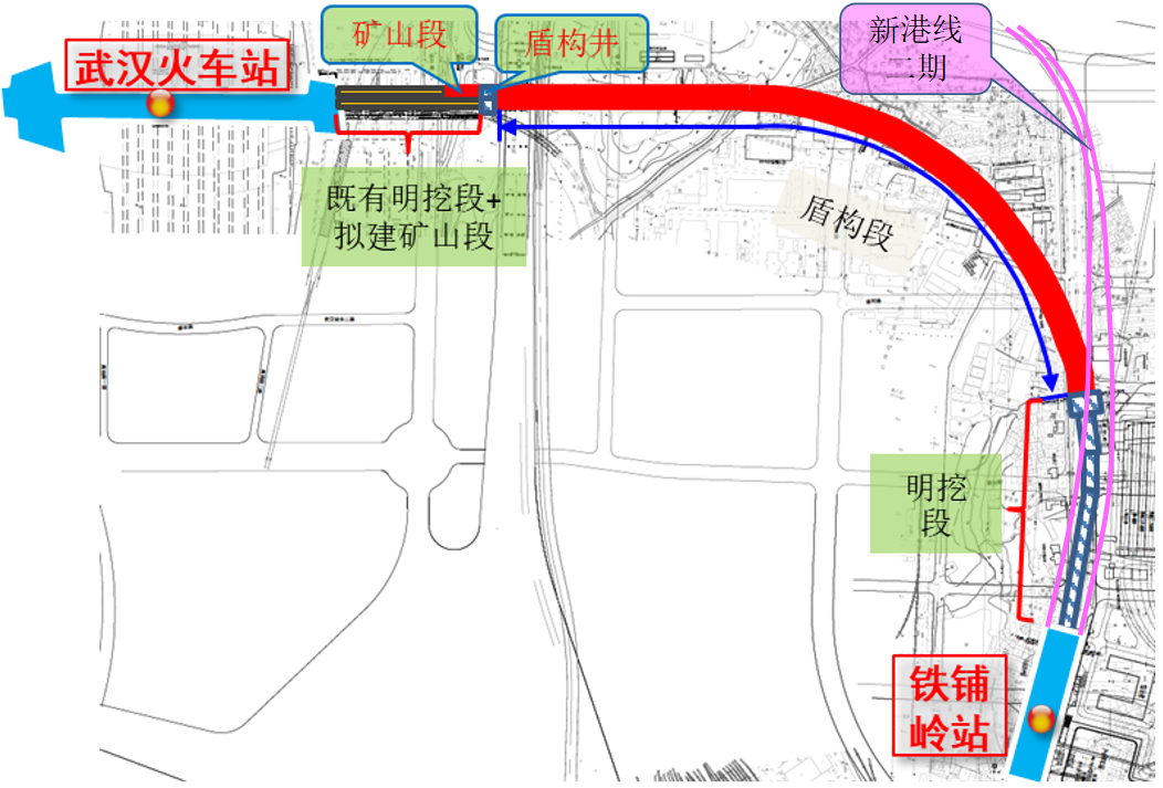 武漢市軌道交通新港線一期工程線路全長10.71km,共設(shè)站5座。其中新港線一標(biāo)包含北洋橋站(明挖車站)、北洋橋站~武漢火車站(盾構(gòu)及明挖區(qū)間)、武漢火車站(既有站內(nèi)改造)、武漢火車站~鐵鋪嶺站(盾構(gòu)及明挖區(qū)間)2站2區(qū)間。