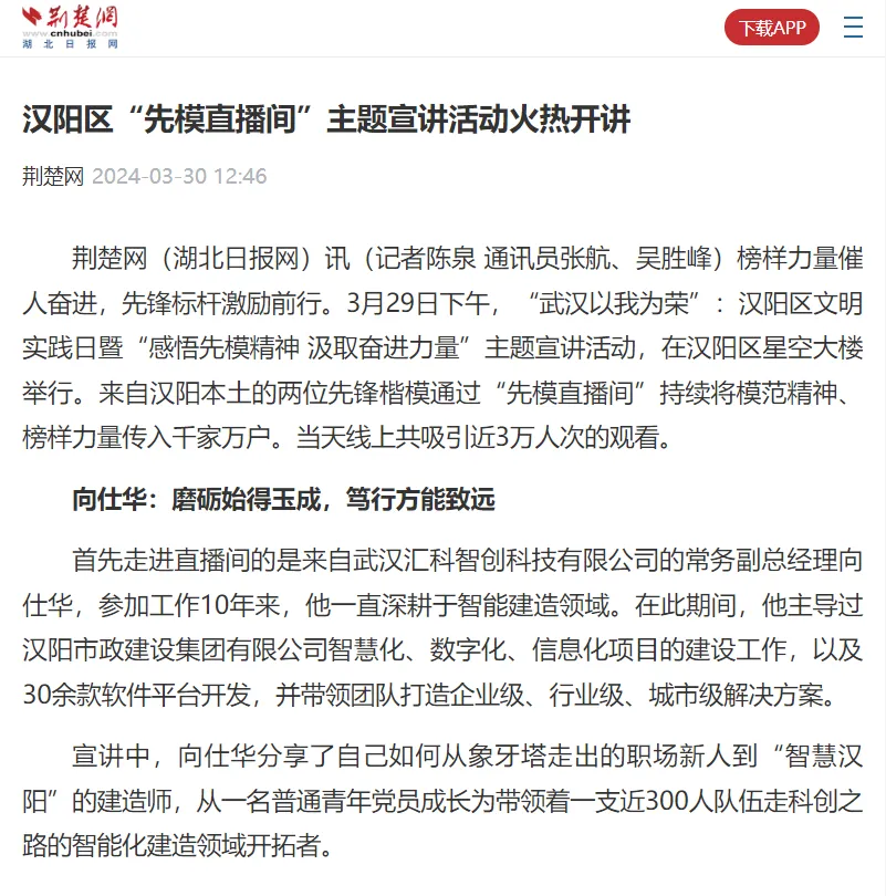 近日,漢陽市政匯科智創(chuàng)常務(wù)副總經(jīng)理向仕華受邀參加“武漢以我為榮”:漢陽區(qū)文明實(shí)踐日暨“感悟先模精神 汲取奮進(jìn)力量”主題宣講活動(dòng)。在“先模直播間”中,向仕華將個(gè)人心路成長變化與匯科智創(chuàng)發(fā)展歷程相結(jié)合,向廣大青年作傾情分享并提供導(dǎo)向建議。
