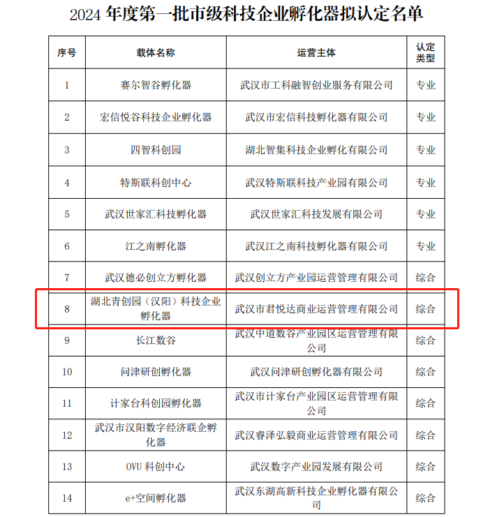 近日,武漢市科技創(chuàng)新局公示了《2024年度第一批市級(jí)科技企業(yè)孵化器認(rèn)定和眾創(chuàng)空間備案名單》,武漢市君悅達(dá)商業(yè)運(yùn)營(yíng)有限公司運(yùn)營(yíng)的湖北青創(chuàng)園(漢陽(yáng))科技企業(yè)孵化器榜上有名,這不僅是園區(qū)發(fā)展歷程中的重要里程碑,更是對(duì)武漢市君悅達(dá)商業(yè)運(yùn)營(yíng)有限公司專(zhuān)業(yè)運(yùn)營(yíng)實(shí)力的最佳注解。