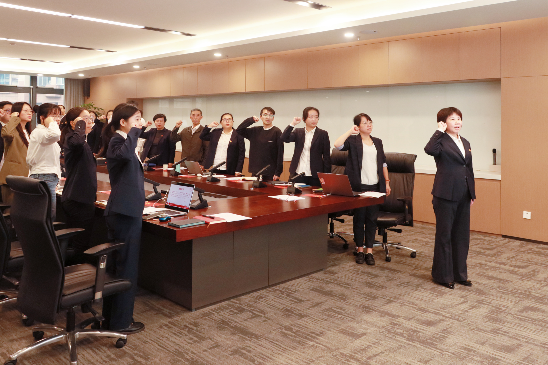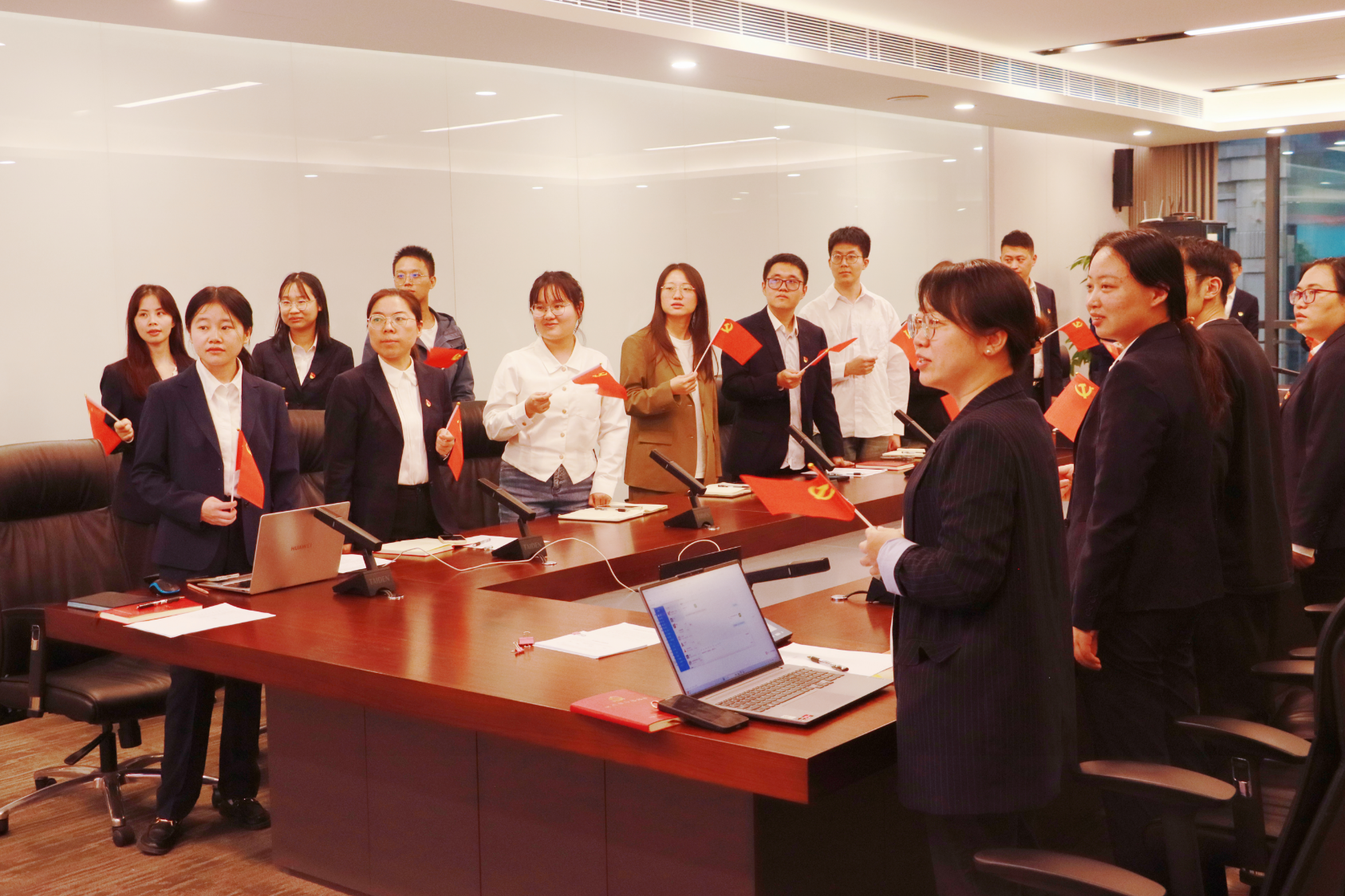在紅色歌曲合唱環(huán)節(jié),全體黨員合唱經(jīng)典歌曲《我和我的祖國》,揮動著手中的黨旗,婉轉的旋律、激昂的歌聲在會議室回蕩,激起廣大黨員的愛黨愛國之情。